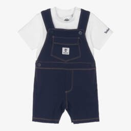 A pale blue and white dungaree set for baby boys by Kissy Kissy, made in soft and comfortable Pima cotton jersey. The sweet dungarees are embroidered with a charming rocking horse motif on the front, while the long-sleeved bodyvest has a smart collar. Both pieces fasten with poppers for quick and easy dressing.