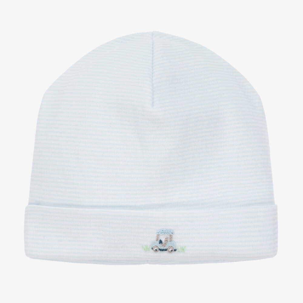 Pale blue and white finely striped layette hat for baby boys by Kissy Kissy, made in a double layer of super soft Pima cotton jersey. This comfortable hat has a sweet turned-up brim, hand-embroidered with a charming golf cart design.
