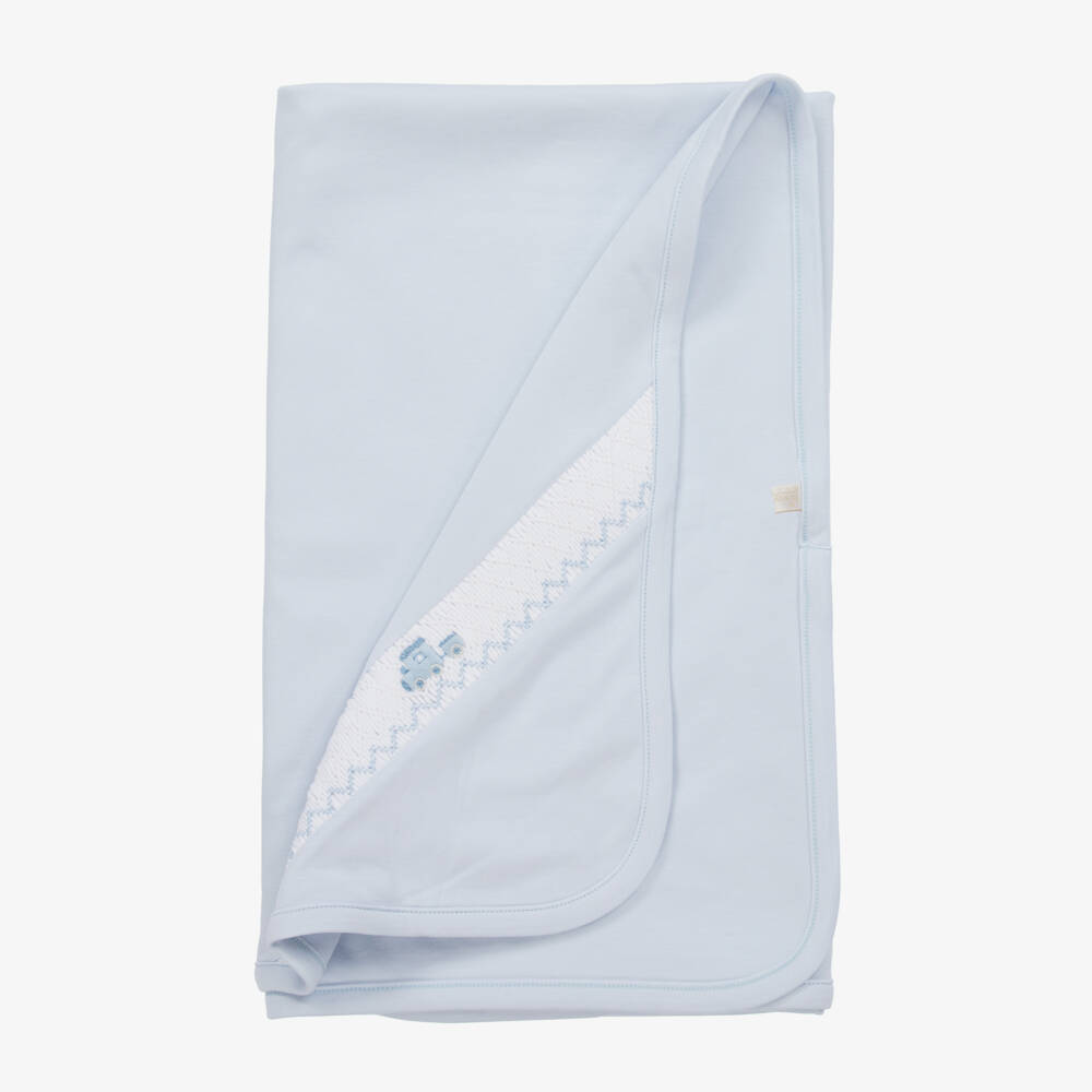 A charming pale blue blanket for baby boys by Kissy Kissy. Made from soft Pima cotton jersey, the lovely white hand-smocked panel decorating one corner is embroidered with a blue train motif for a sweet finish.