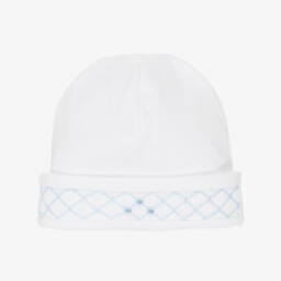 Pale blue hat for baby boys by Kissy Kissy, made in super soft Pima cotton jersey. With a turned-up brim, it features a delicate smocked panel on the front with the sweet embroidered flowers.