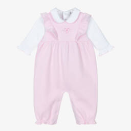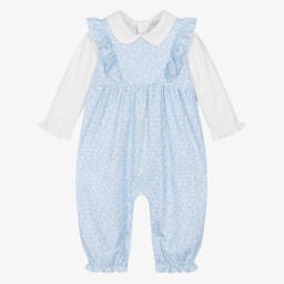 White and blue dungaree set for little boys by Kissy Kissy, made in super soft Pima Cotton jersey. The bodyvest is patterned in a cute dinosaur print in blue and green, and the dungarees have a sweet embroidered dinosaurs on the front. Both pieces have poppers for easy fastening.