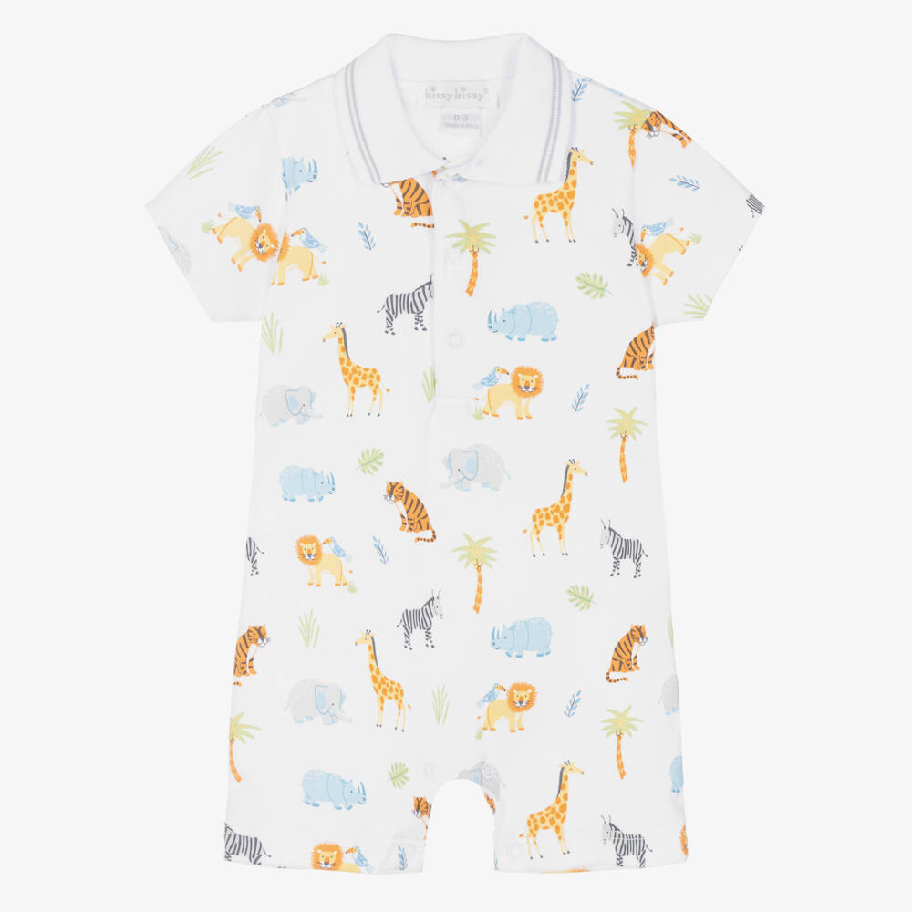 White shortie for baby boys by Kissy Kissy, made in super soft Pima cotton jersey. Patterned with a colourful jungle print, this one-piece has popper fastenings on the front and between the legs for easy dressing. It has a pointed, ribbed collar with sporty stripes for a cute finish.