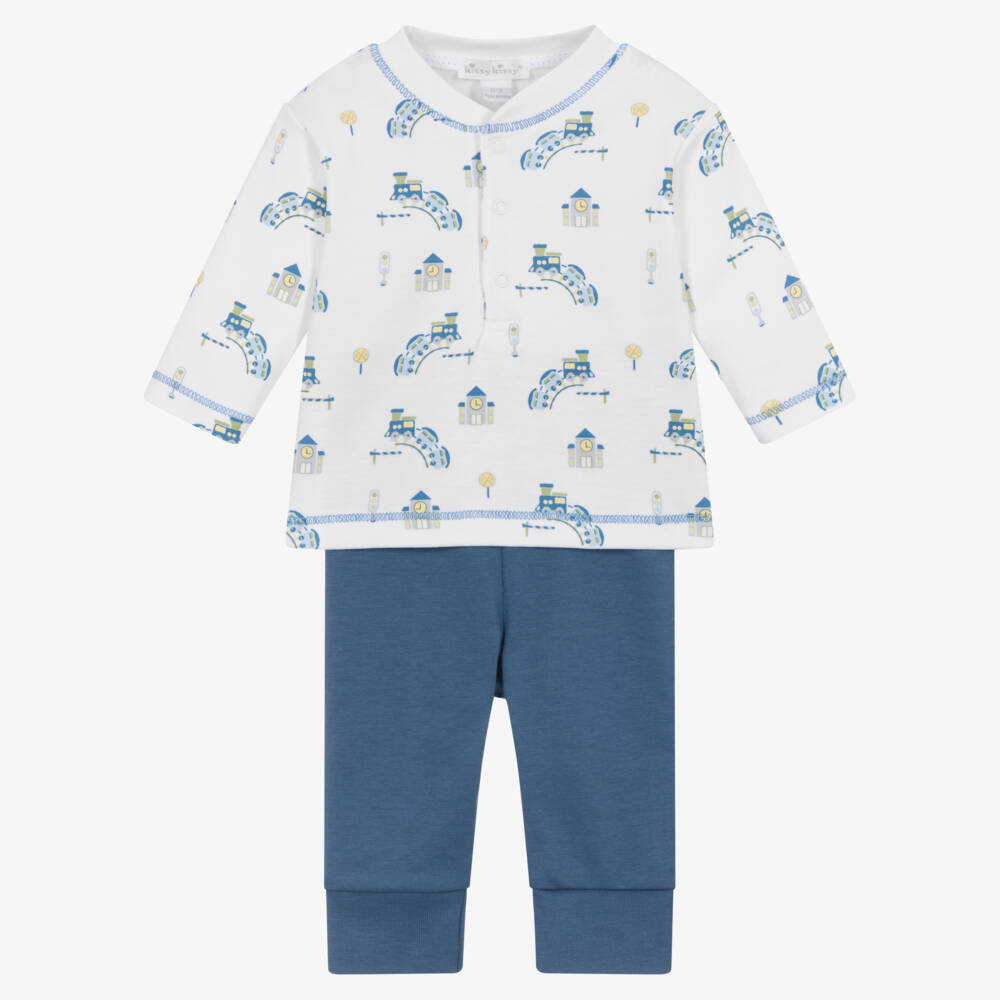 Sweet white and blue trouser set for baby boys, by Kissy Kissy. This Pima cotton jersey set comprises a white long-sleeve top with popper fastenings and an adorable train and clock tower print. Plain, elasticated navy blue trousers complete the casual, coordinating baby set.