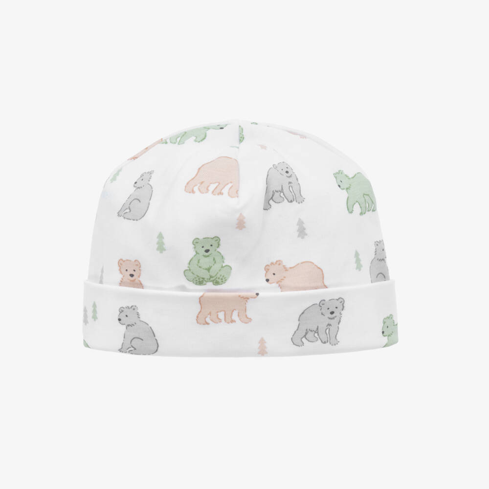 White hat for baby boys from Kissy Kissy, made in a double layer of soft Pima cotton for lasting comfort. Full of character, it is patterned with friendly little bears and trees in grey, beige and green.