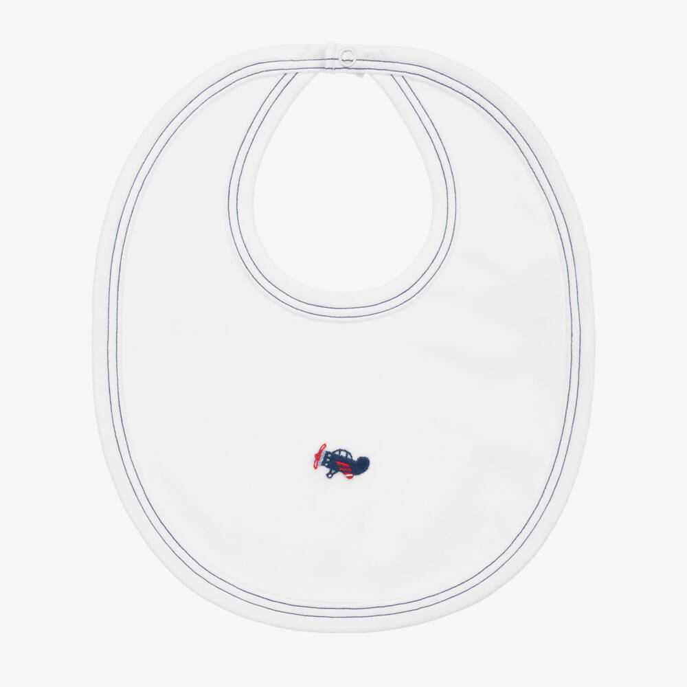 White bib for baby boys by Kissy Kissy, made in beautifully soft, double-layered Pima cotton jersey. Ideal for catching dribble or small spills, it has a delicate, hand-embroidered aeroplane on the front and a navy blue trim. There is a popper fastening on the back of the neck for easy dressing.