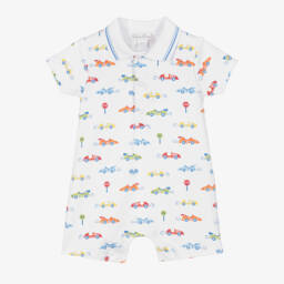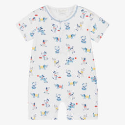 Sweet white Pima cotton shortie for baby boys by Kissy Kissy, with a colourful jungle animal print. It is made in super soft, comfortable jersey in a polo shirt style, with a tipped, ribbed collar and a half placket.
