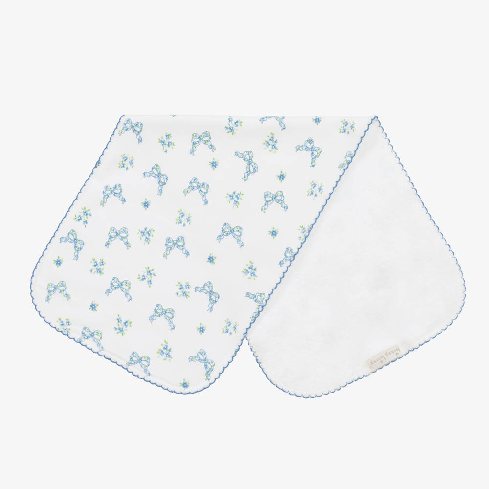 Sweet white burp cloth for baby girls by Kissy Kissy, with a lovely bow and floral print in blue and green. Made in beautifully soft Pima cotton jersey, it has an absorbent cotton towelling backing and blue picot trim. This useful feeding accessory can be placed over the shoulder when burping your baby and used for wiping those little spills after a feed.