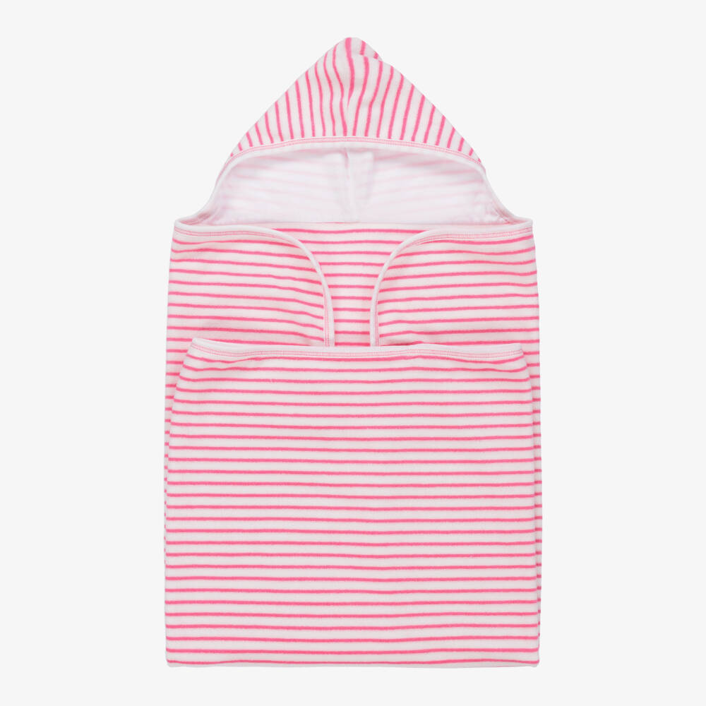 Pink and white striped hooded towel for baby girls by Kissy Kissy, made in super soft Pima cotton terry. Cosy and comfy, it's ideal for wrapping up little ones after a day on the beach. The hood is lined in soft jersey and fits snugly over the head.