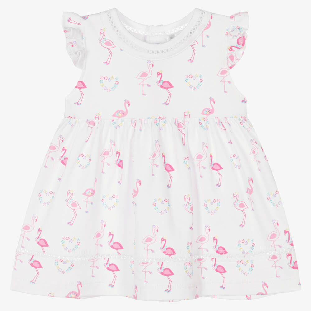 White dress for baby girls by Kissy Kissy, with a sweet pink flowers and flamingos print. Made in super soft and comfortable Pima cotton jersey, the dress has frills over the shoulders and pretty cross-stitch detailing. It fastens with easy-to-use poppers around the back and comes with useful bloomers. The bloomers have an elasticated waist for a comfortable fit on little tummies and frilled, elasticated cuffs.