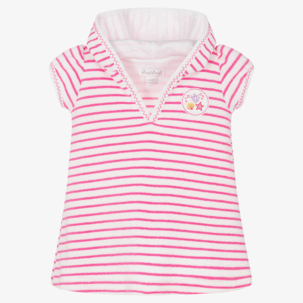 Pink and white striped towelling dress for baby girls by Kissy Kissy, made in super soft Pima cotton terry. Ideal as a beach cover-up, it slips on easily over the head, and has a comfortable jersey lined hood. There is an appliquéd patch on the chest, with pretty sea creature embroidery.