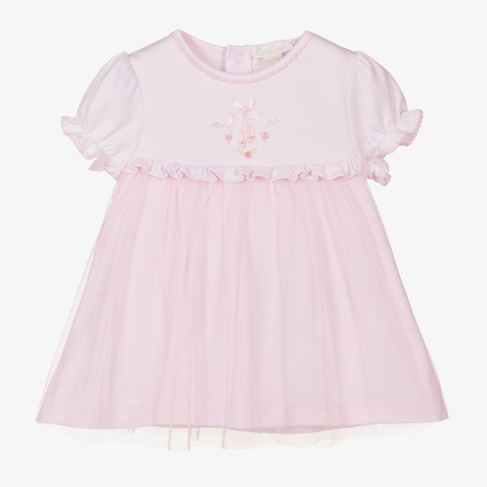 So pretty for baby girls, a pink Pima cotton dress from Kissy Kissy. Made in beautifully soft and comfortable jersey, it has cute ruffle trims and a fine pink tulle overlay on the skirt. A lovely hand-embroidered ballet slippers motif with pink roses and satin trim gives a luxurious finish. The dress comes with matching knickers that are gently elasticated, and it fastens easily with poppers on the back.