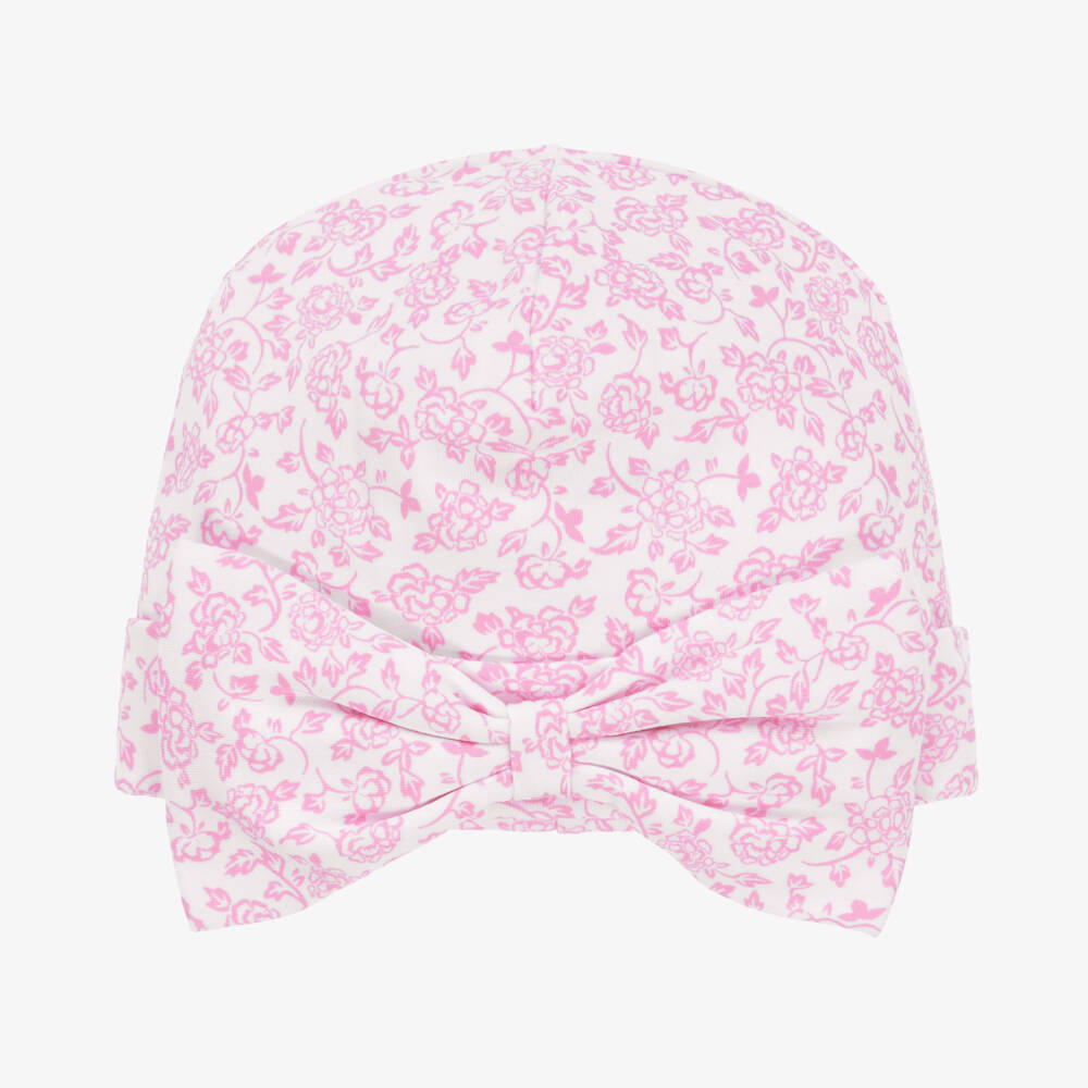Pretty white and pink hat for baby girls by Kissy Kissy, made in soft Pima cotton jersey. Ideal for keeping little heads warm, it has a lovely flower and trailing vines print. There is a large bow on the front for a cute and girly look.
