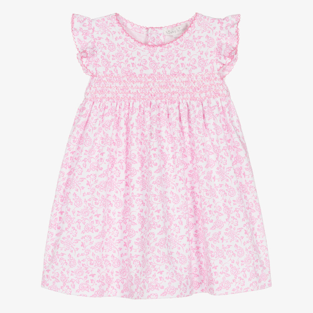 Pretty white dress for baby girls by Kissy Kissy, with a pink floral pattern. It is made in super soft, comfortable Pima cotton jersey, with sweet shirring across the bodice and pink picot trims. There are feminine ruffles over the shoulders, popper fastenings around the back and a full, gathered skirt. Smaller sizes come with useful matching bloomers.