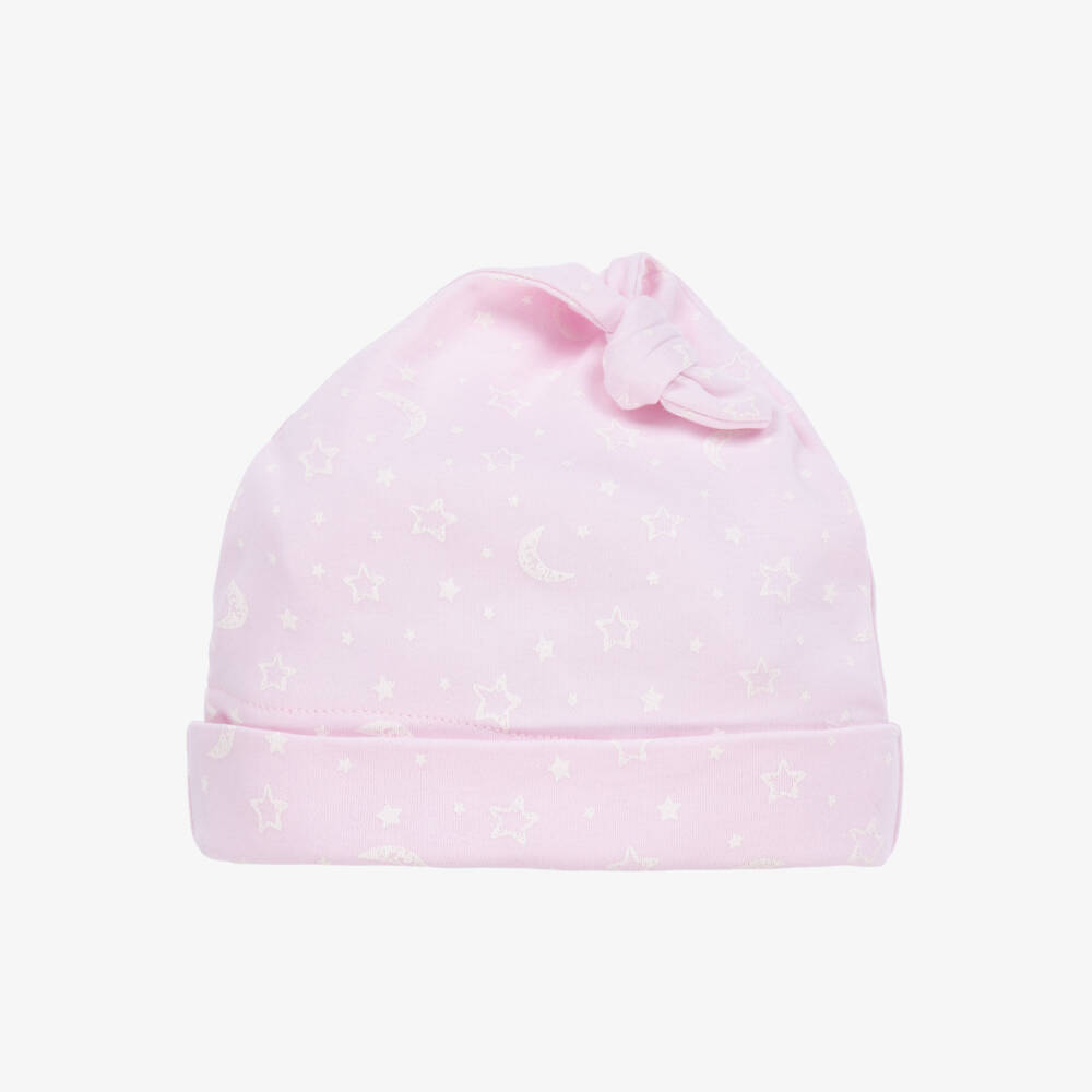 A light pink hat for baby girls by Kissy Kissy, so soft in a double layer of Pima cotton. With an adorable knot design on the top, this charming hat has a delicate print of stars and crescent moons.
