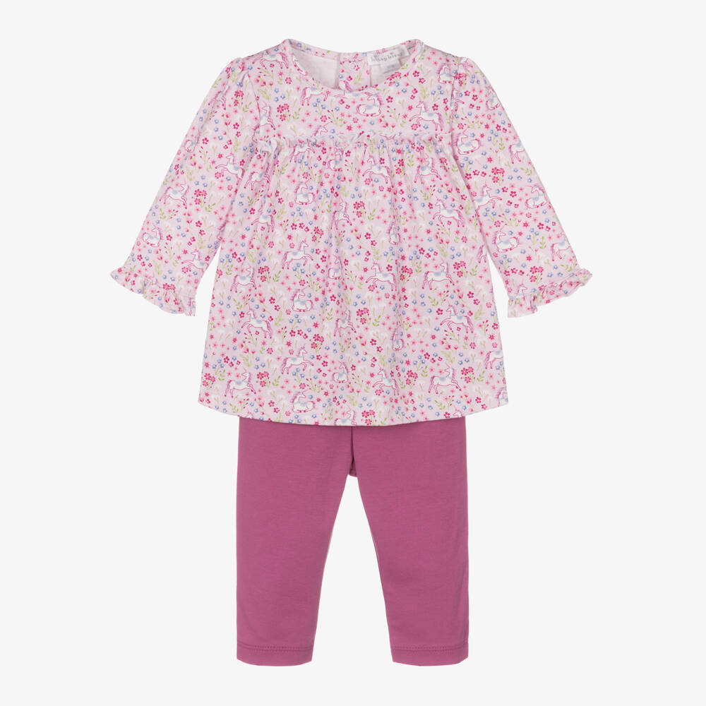 A sweet leggings set for baby girls by Kissy Kissy, in tones of pink and made from super-soft Pima cotton jersey. Patterned with characterful unicorns and florals, the long-sleeved top has frilled edges and easy-to-use poppers on the back. The matching leggings have a conveniently elasticated waist for simple dressing.