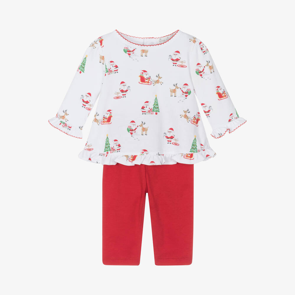 A delightful red and white leggings set for baby girls by Kissy Kissy, made from soft Pima cotton jersey. The long-sleeved top has a fun and festive pattern featuring Santa Claus, reindeers, and Christmas trees. There are frills on the cuffs and hemline, and popper fastenings on the back to make dressing easier. In a simple style, the full-length leggings have a comfortable elasticated waist.