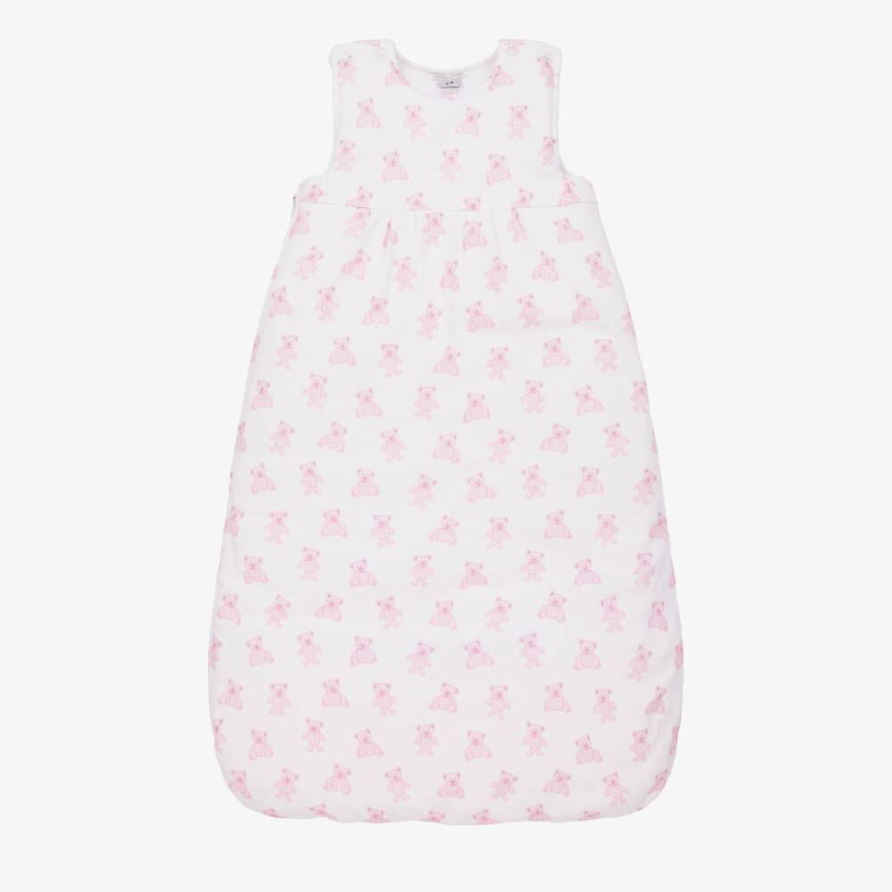 Baby girls white sleeping bag by Kissy Kissy, made in beautifully soft Pima cotton jersey. With a cosy padding, it is patterned with an adorable pink check teddy bear print all-over. It easily fastens with poppers on the shoulders and has a smooth zip fastening on the side.