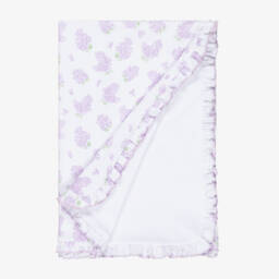 This lovely purple lilac love pattern blanket for baby girls by Kissy Kissy, offers comfort and style. Made in a double layer of soft Pima cotton jersey, it features a delightful floral print and ruffled edges.