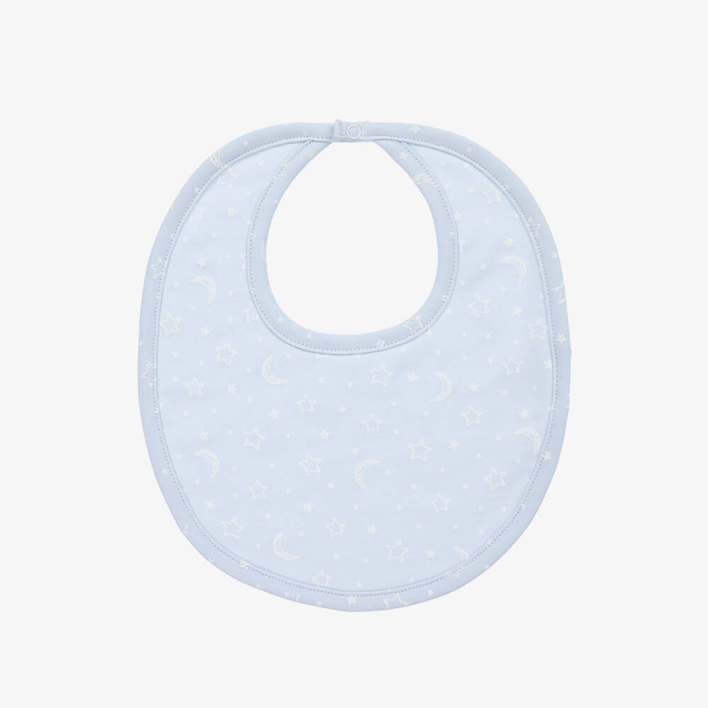 A light blue bib for baby boys by Kissy Kissy, patterned with stars and crescent moons. It is made in super-soft Pima cotton and designed with a towelling underside to help catch those little spills. There is a popper to secure the bib easily on the back of baby's neck.