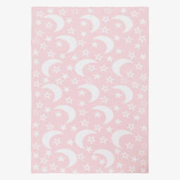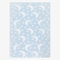 Cosy pale blue blanket for baby boys by Kissy Kissy, featuring a delightful moon and star pattern. Warmly knitted in soft cotton, this lovely nursery accessory is ideal for use in the pram and stroller.