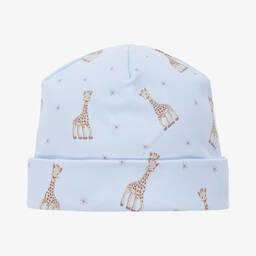 Baby boys blue hat from Kissy Kissy. Made in a double layer of the softest Pima cotton jersey, with a sweet Sophia la Girafe print, and turned up brim.