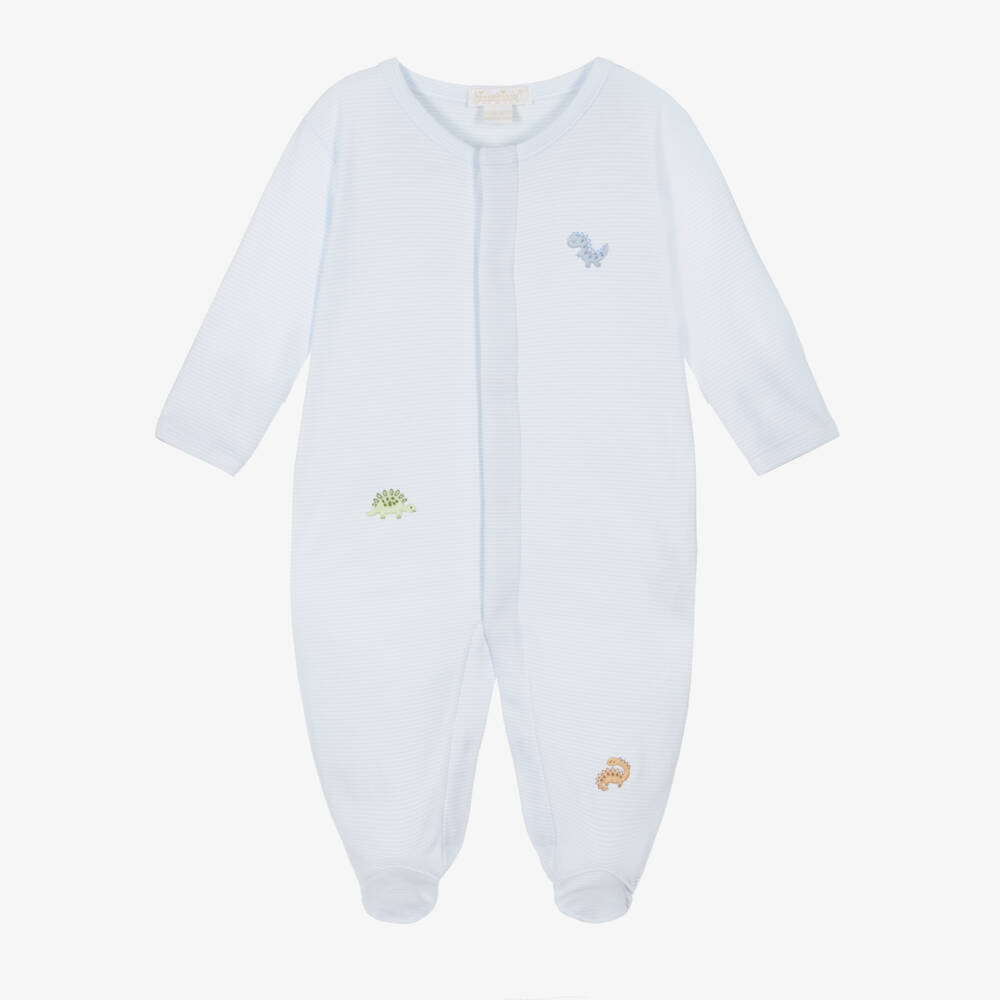 Pale blue babygrow for boys by Kissy Kissy, made in super soft Pima cotton jersey. It is patterned in fine horizontal stripes, with cute hand-embroidered dinosaur motifs on the front. There are concealed poppers for easy fastening and protective fold-over scratch mitts on the smaller sizes.