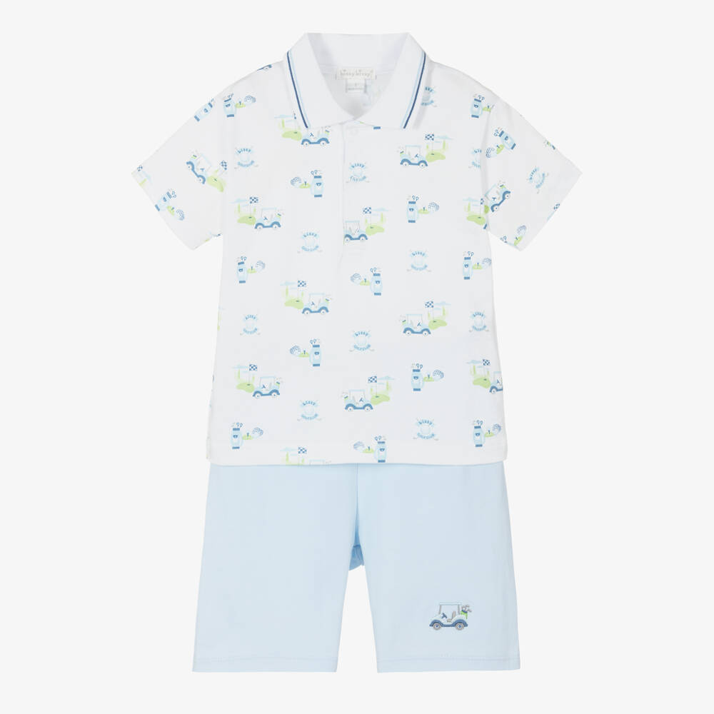 A white and pale blue shorts set for boys by Kissy Kissy, made from super soft Pima cotton jersey. Printed in an adorable golf-inspired pattern, the polo shirt has a pointed collar with striped detailing and popper fastenings on the chest. The coordinating shorts are embroidered with a sweet golf-cart motif by the hem, and have a comfortable elasticated waist with a faux drawstring.