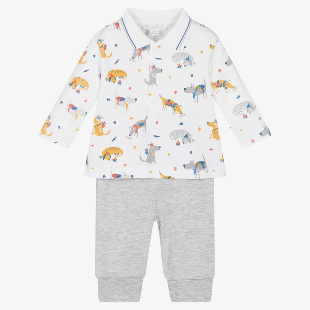 Lovely white and grey trouser set for baby boys by Kissy Kissy, made in super soft and stretchy Pima cotton jersey. Kind and gentle against delicate skin, the long-sleeved top has a fun yellow and grey puppy print with a blue and grey trim on the ribbed collar. It fastens with poppers on the front for quick and easy dressing. The coordinating grey trousers have a gently elasticated waist for a comfortable fit.