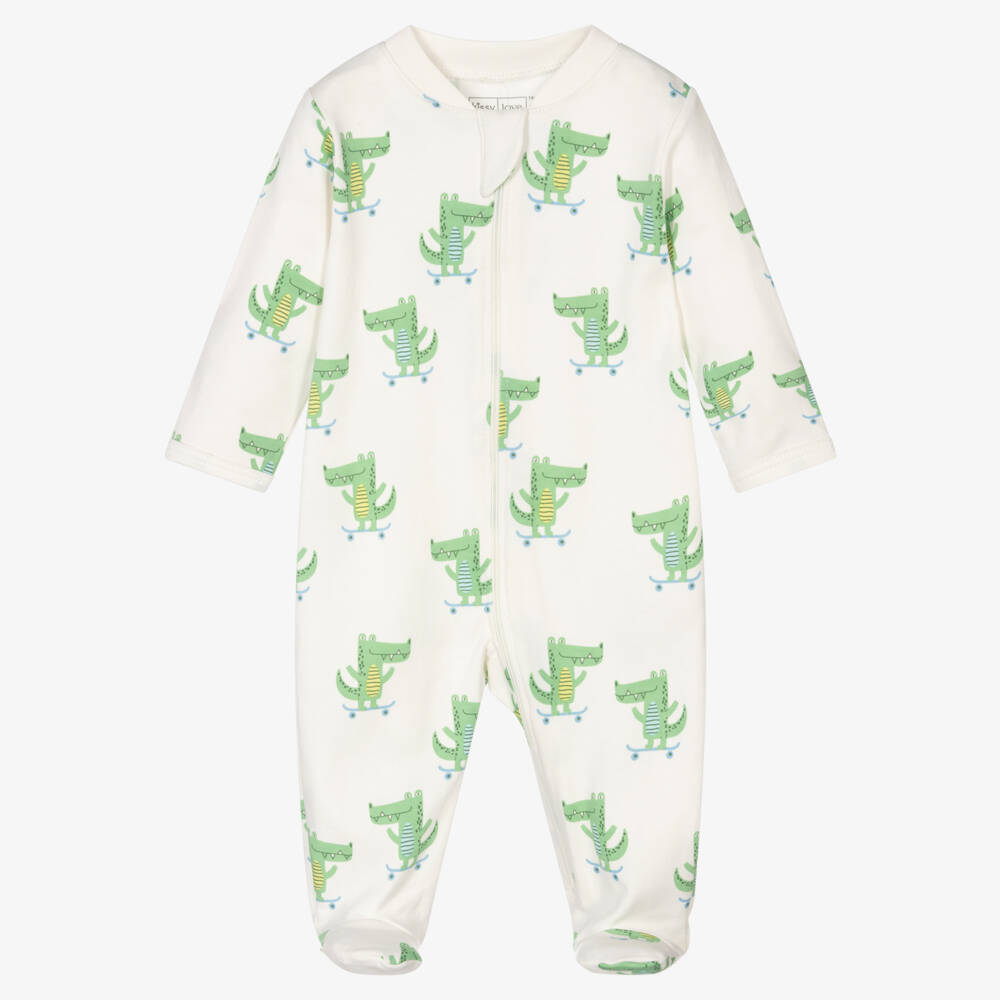 Ivory babygrow for little boys by Kissy Love, made in luxuriously soft Pima cotton jersey. Fastening with a smooth front zip, it has a quirky green skateboarding crocodile print all-over and a chin guard for safety and comfort. The tiny sizes come with useful fold-over scratch mitts.