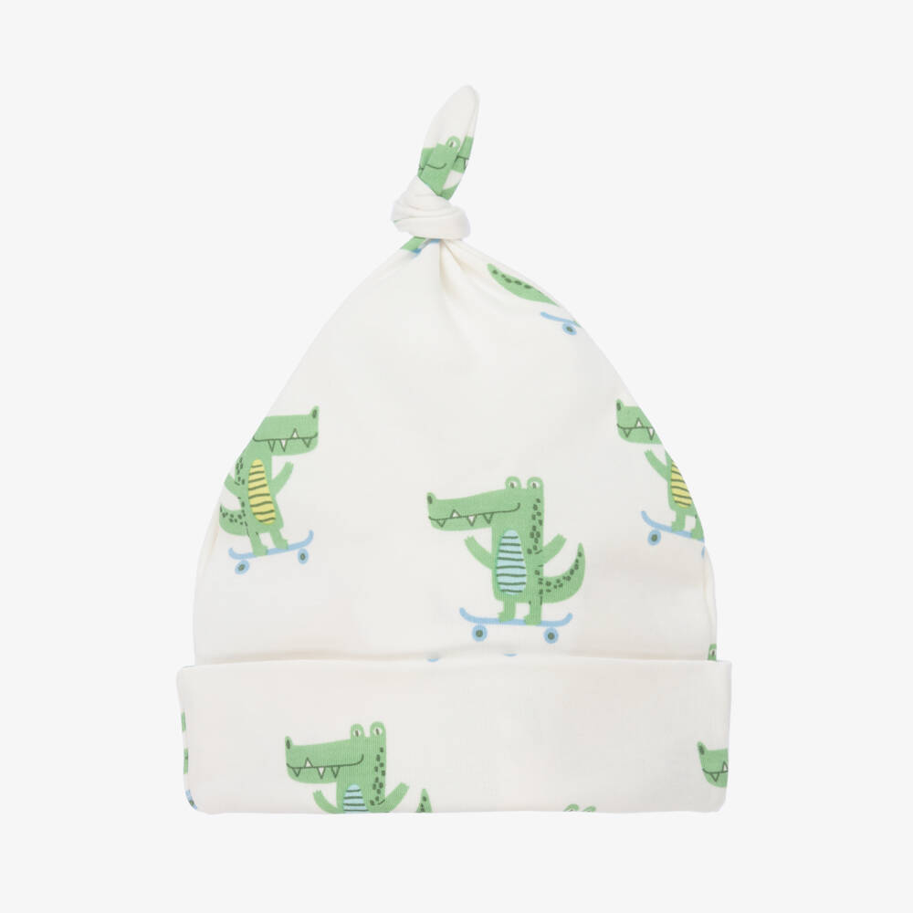 Sweet ivory hat for baby boys from Kissy Love, made in extra soft Pima cotton jersey. It is printed with a fun green crocodile print with a turned-up brim and finished with a little top knot.