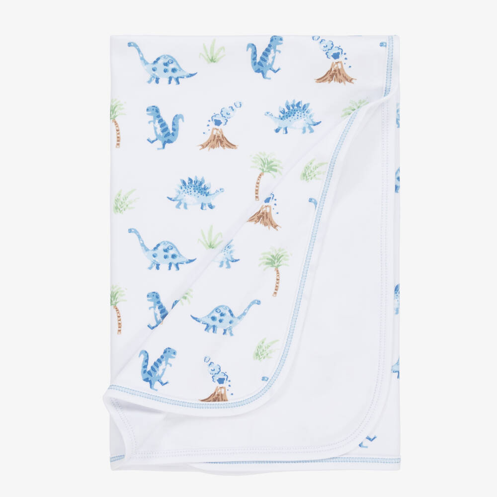 White blanket for baby boys by Kissy Kissy, made in a double layer of luxuriously soft Pima cotton. It is patterned with a fun blue dinosaur print and exposed blue stitching on the edges. The reverse is plain white. A versatile nursery accessory, it can be used to wrap around baby or when out and about in the pram or car seat.