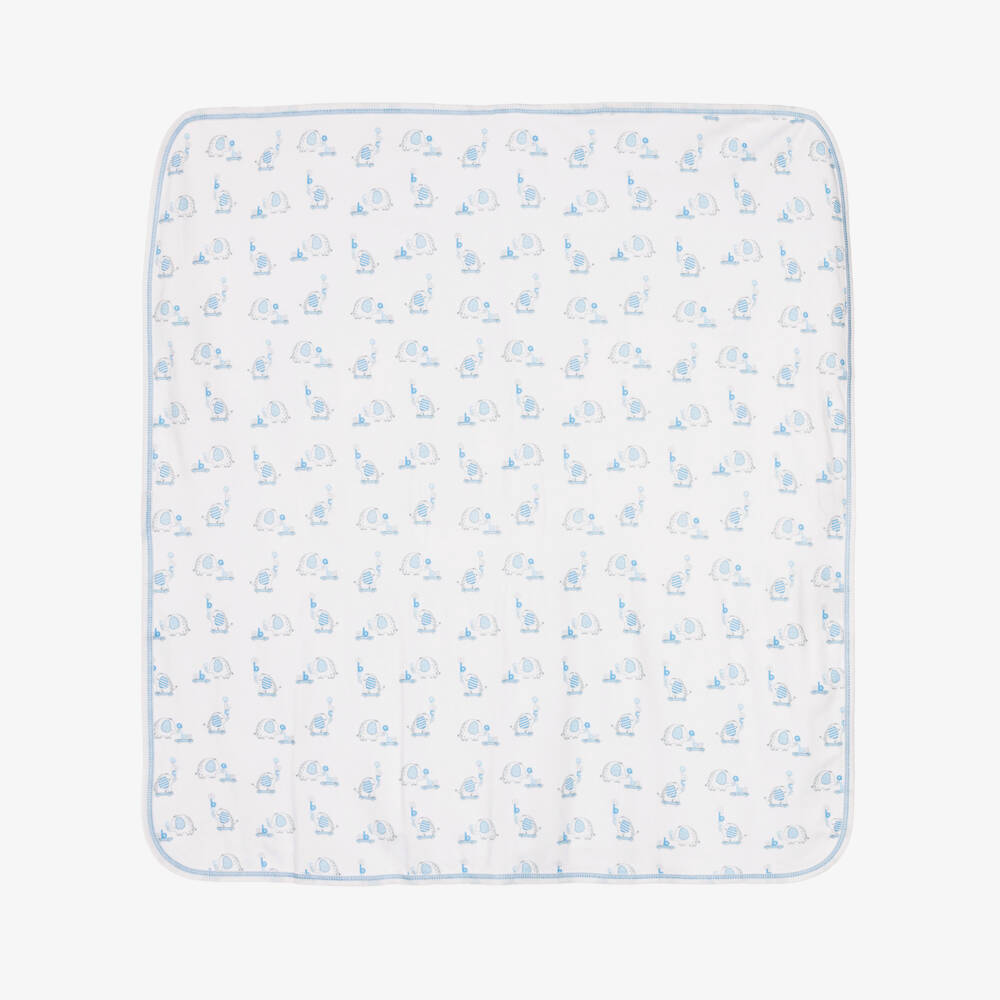 White and pale blue blanket for baby boys by Kissy Kissy, made in a double layer of luxuriously soft Pima cotton. It has a playful blue and grey elephant print with exposed blue stitching on the edges. The reverse is plain white. A versatile nursery accessory, it can be used to wrap around your baby or when out and about in the pram or car seat.