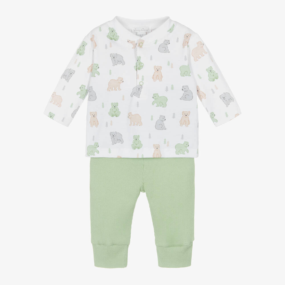 An adorable white and green trouser set for baby boys by Kissy Kissy. Gentle on delicate skin, it is made in super soft Pima cotton jersey. The top has a lightly ribbed collar, with a sweet all-over bear print in green, grey and beige. It fastens with poppers on the front. The lightly textured trousers have cuffed ankles and a gently elasticated waist for a comfortable fit.