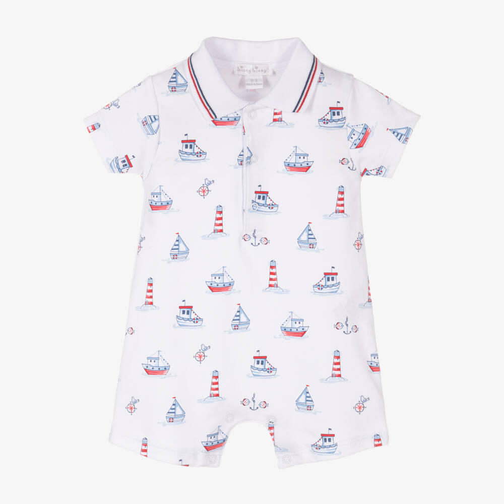 Cute white Pima cotton shortie for baby boys by Kissy Kissy, with a red and blue sailboat and lighthouse print. It is made in super soft, comfortable jersey in a polo shirt style, with a tipped, ribbed collar and a half placket.
