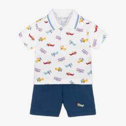 Comfortable white top and pale blue shorts set for younger boys by Kissy Kissy, made in super soft Pima cotton jersey. Patterned with a colourful boat print, the polo shirt has blue stripes on the ribbed collar and fastens easily with poppers on the front. The shorts have an elasticated waist with a decorative tie detail and a lovely embroidered boat motif on one leg.