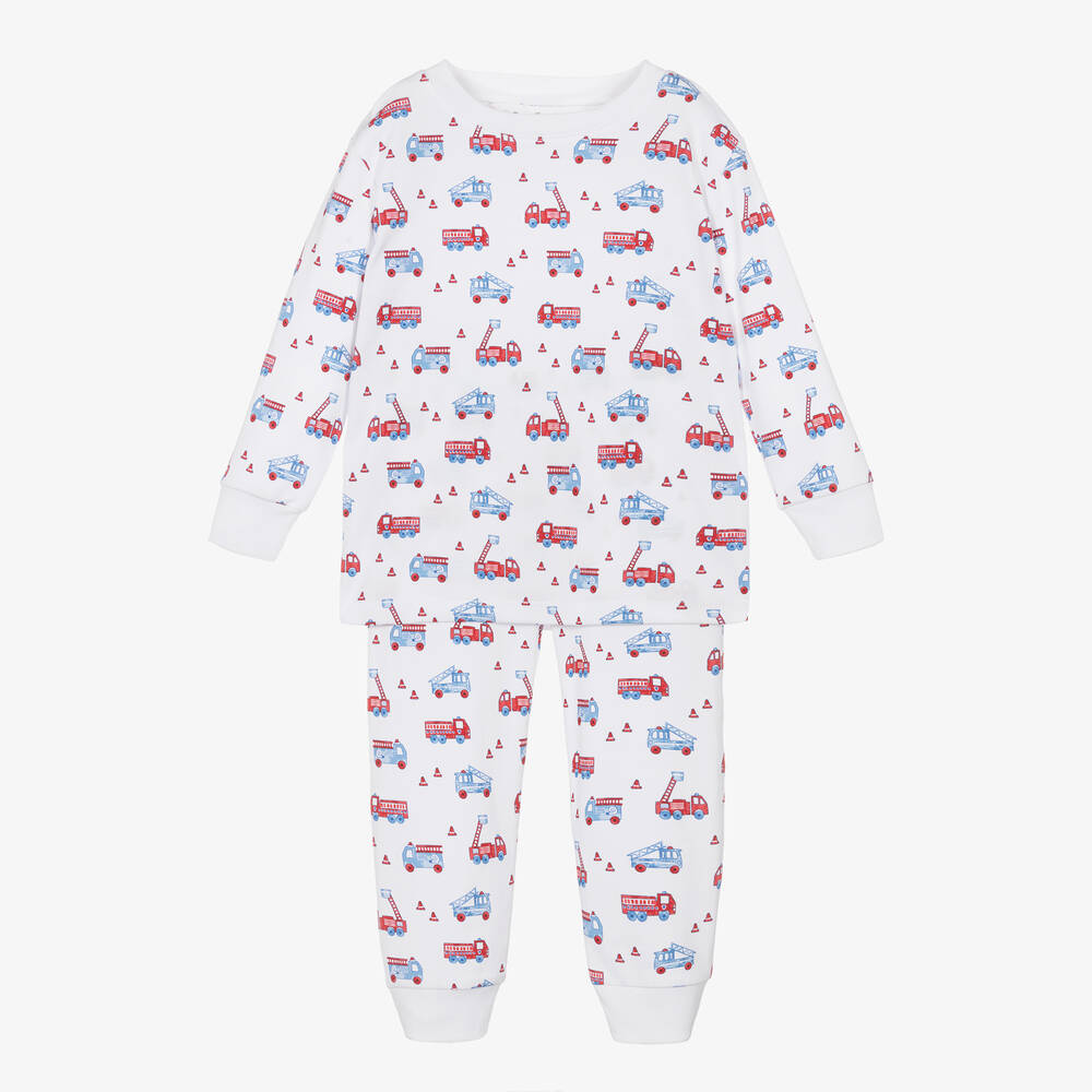 White long pyjamas for boys by Kissy Kissy, made in super soft Pima cotton jersey. They are patterned in a fun fire truck print in blue and red. The trousers have a gently elasticated waist for a comfortable fit.