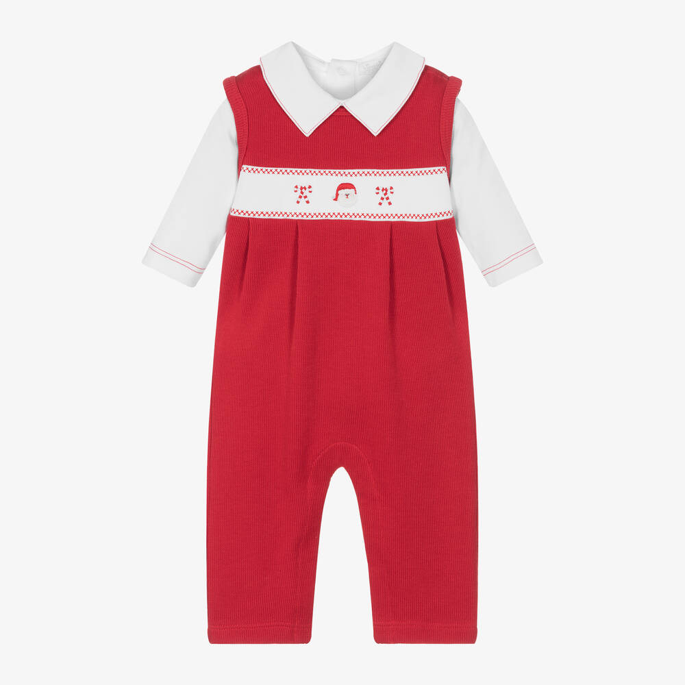 A lovely red and white babysuit set for boys by Kissy Kissy, made from soft Pima cotton. The knitted sleeveless romper has a white chest panel that is beautifully hand-embroidered with cute Santa and candy cane motifs, inspired by the festive season. Simply styled, the jersey bodysuit has red topstitching on the sweet pointed collar and cuffs. Both pieces fasten with poppers to make dressing easier.