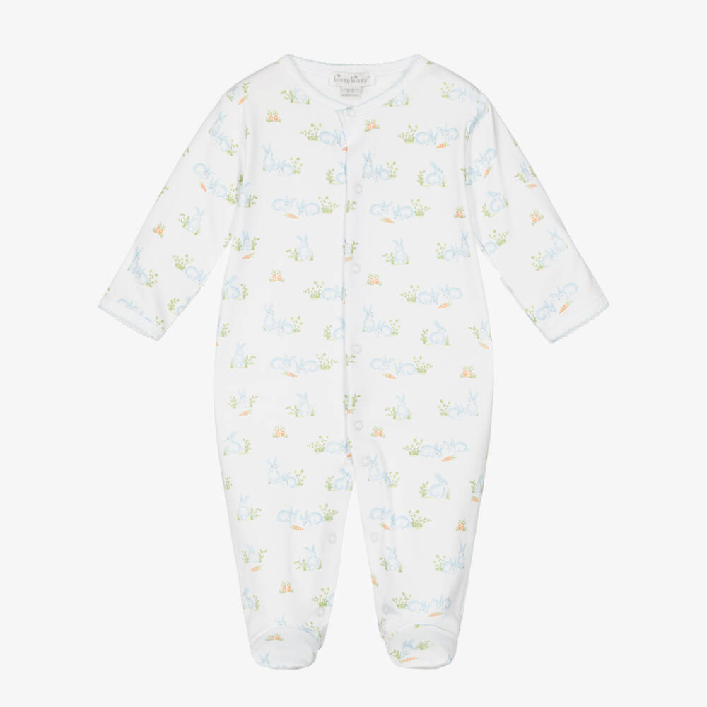 Adorable white babygrow for boys by Kissy Kissy, made in beautifully soft Pima cotton jersey for a gentle feel against delicate skin. Patterned with cute blue bunny rabbits, this sweet one-piece fastens on the front with poppers for quick and easy dressing.