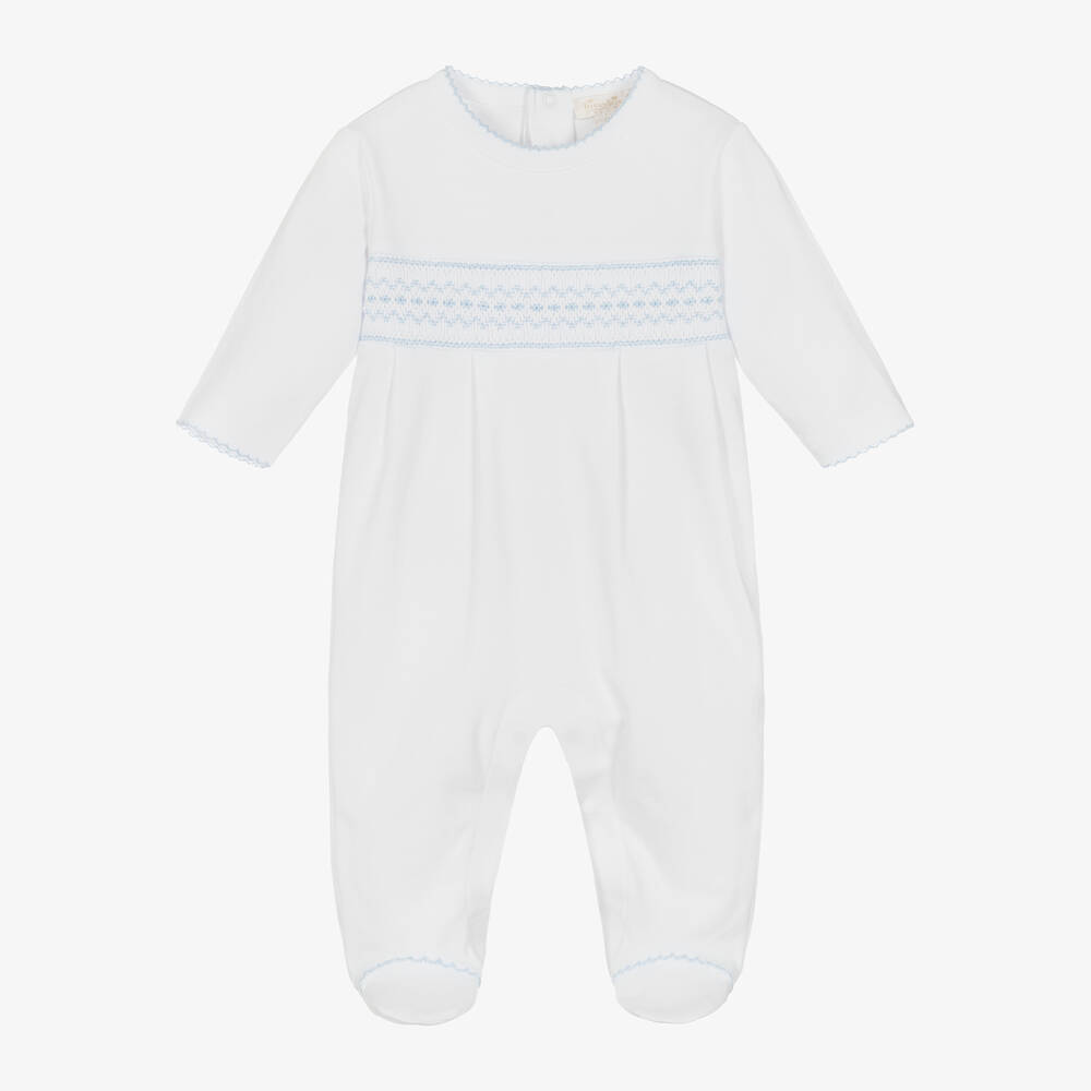 A lovely white babygrow for boys by Kissy Kissy, made from soft Pima cotton jersey. For a charming look, it has a hand-smocked panel across the chest with pale blue embroidery and matching picot trims on the neckline, cuffs, and feet. There are popper fastenings on the back and between the legs to help with dressing.