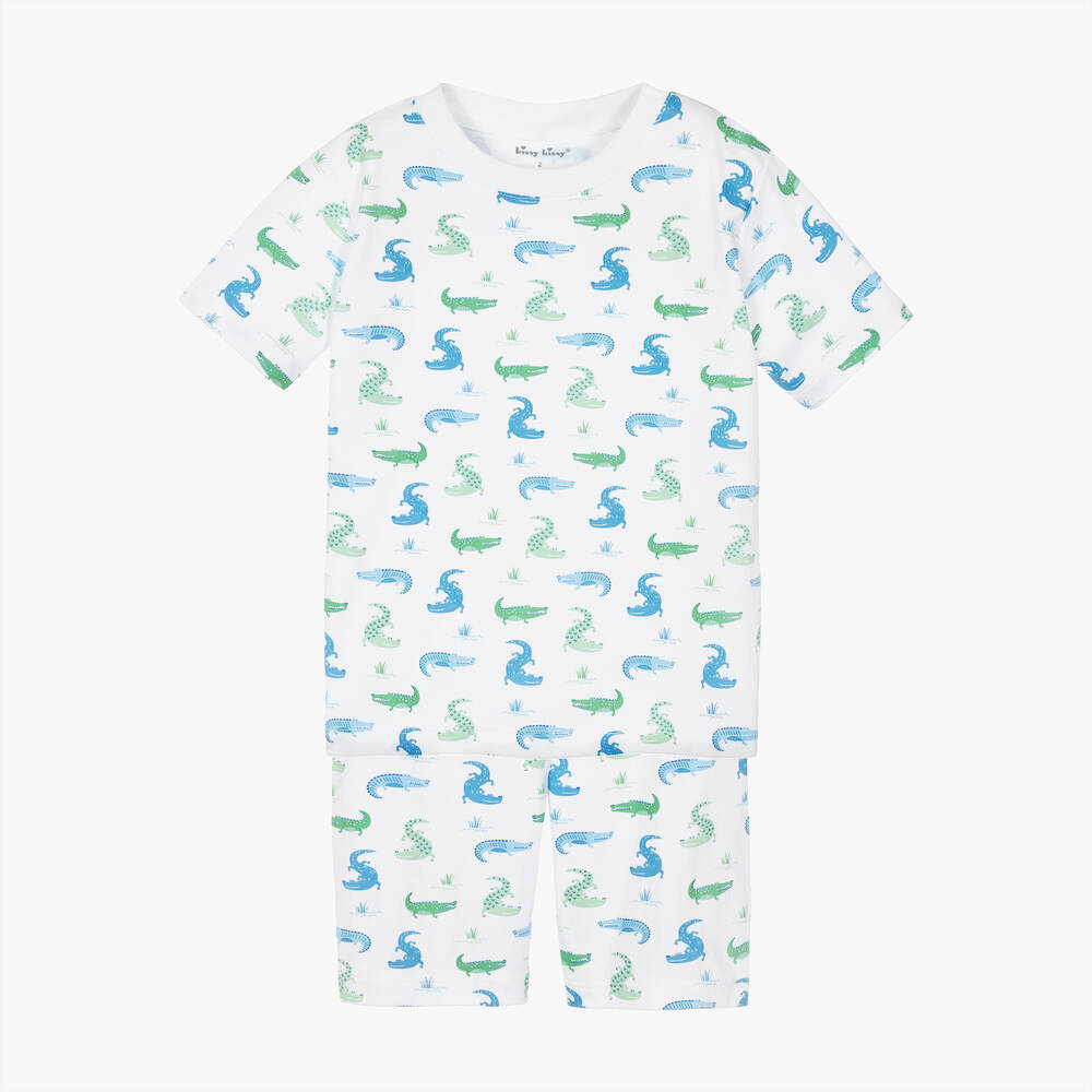 White short pyjamas for boys by Kissy Kissy, made in super soft Pima cotton jersey with a fun crocodile print in blue and green. The short-sleeved top has a ribbed crew neck and the shorts have a gently elasticated waist, ideal for a comfortable night's sleep.