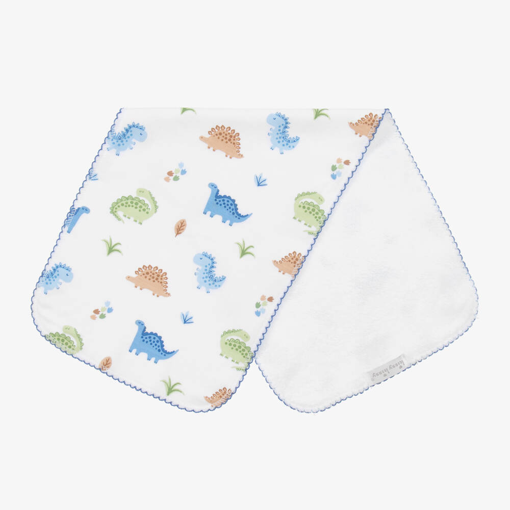 Printed with an adorable dinosaur pattern, this white burp cloth for baby boys is by Kissy Kissy. Finished with a neat picot trim, it is made from smooth Pima cotton jersey and has a soft towelling underside for added absorbency when mopping up little spills.