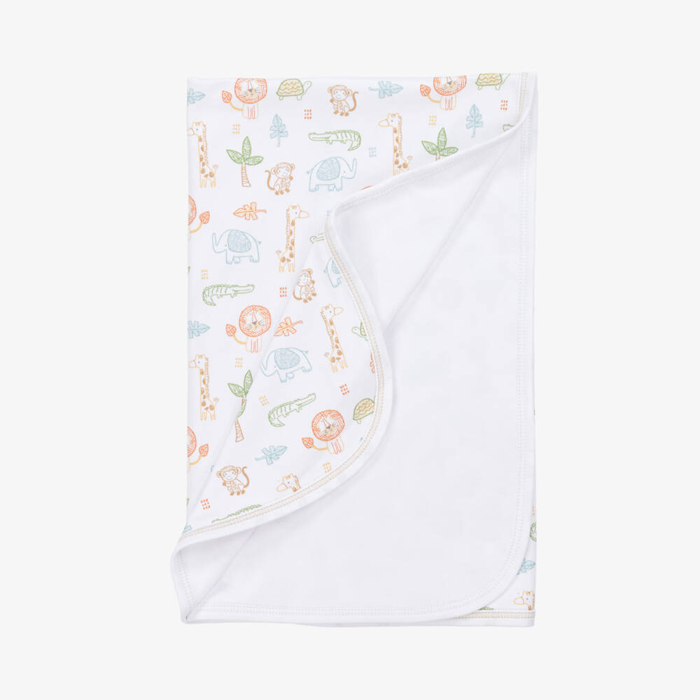 Super soft white Pima cotton blanket for baby boys by Kissy Kissy, with a colourful jungle animal print. Made in a double layer of super soft, comfortable jersey, it is ideal for the nursery or when out and about in the pram or car seat.