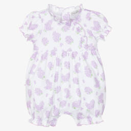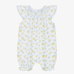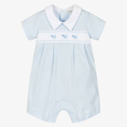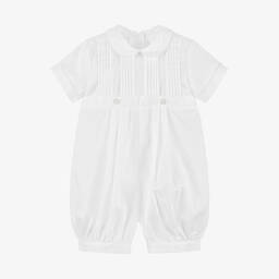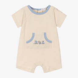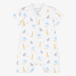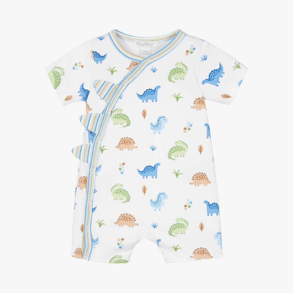 White shortie for baby boys by Kissy Kissy, with a sweet dinosaur pattern in blue, green and beige. Gentle on delicate skin, it is made in super soft Pima cotton jersey. It has a striped diagonal popper fastening down the front, trimmed with fun dinosaur spines.
