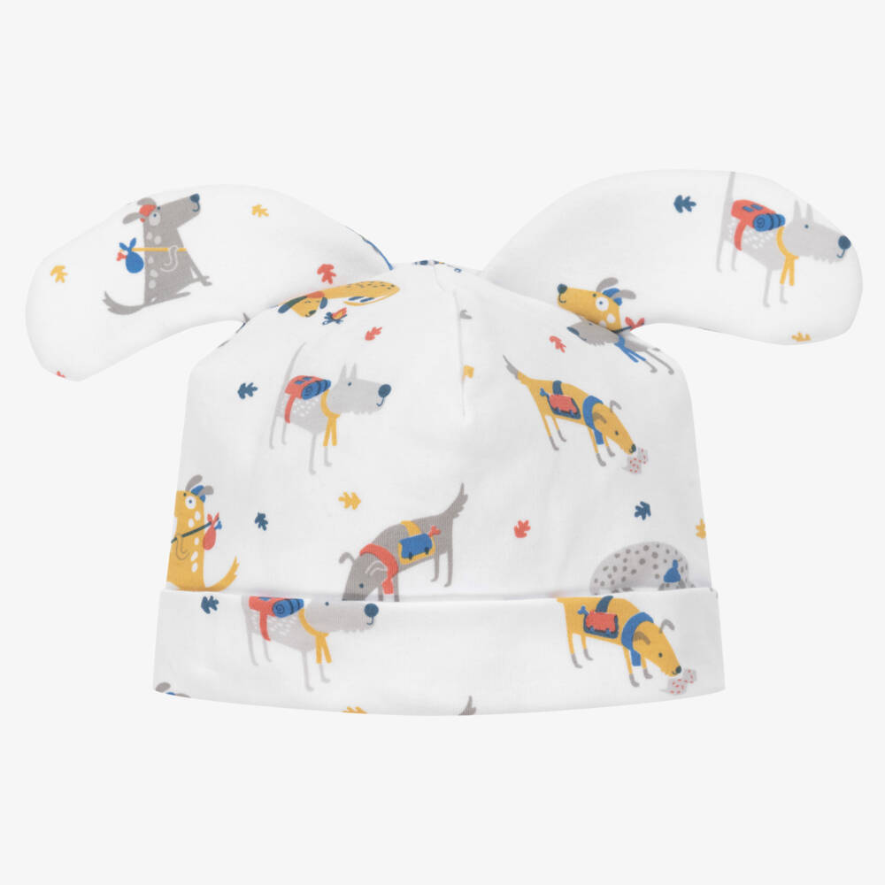 White hat for baby boys by Kissy Kissy, made in a double layer of super soft and stretchy Pima cotton jersey. It has a fun yellow and grey puppy print, a turned-up brim and cute 3D puppy ears on the top.