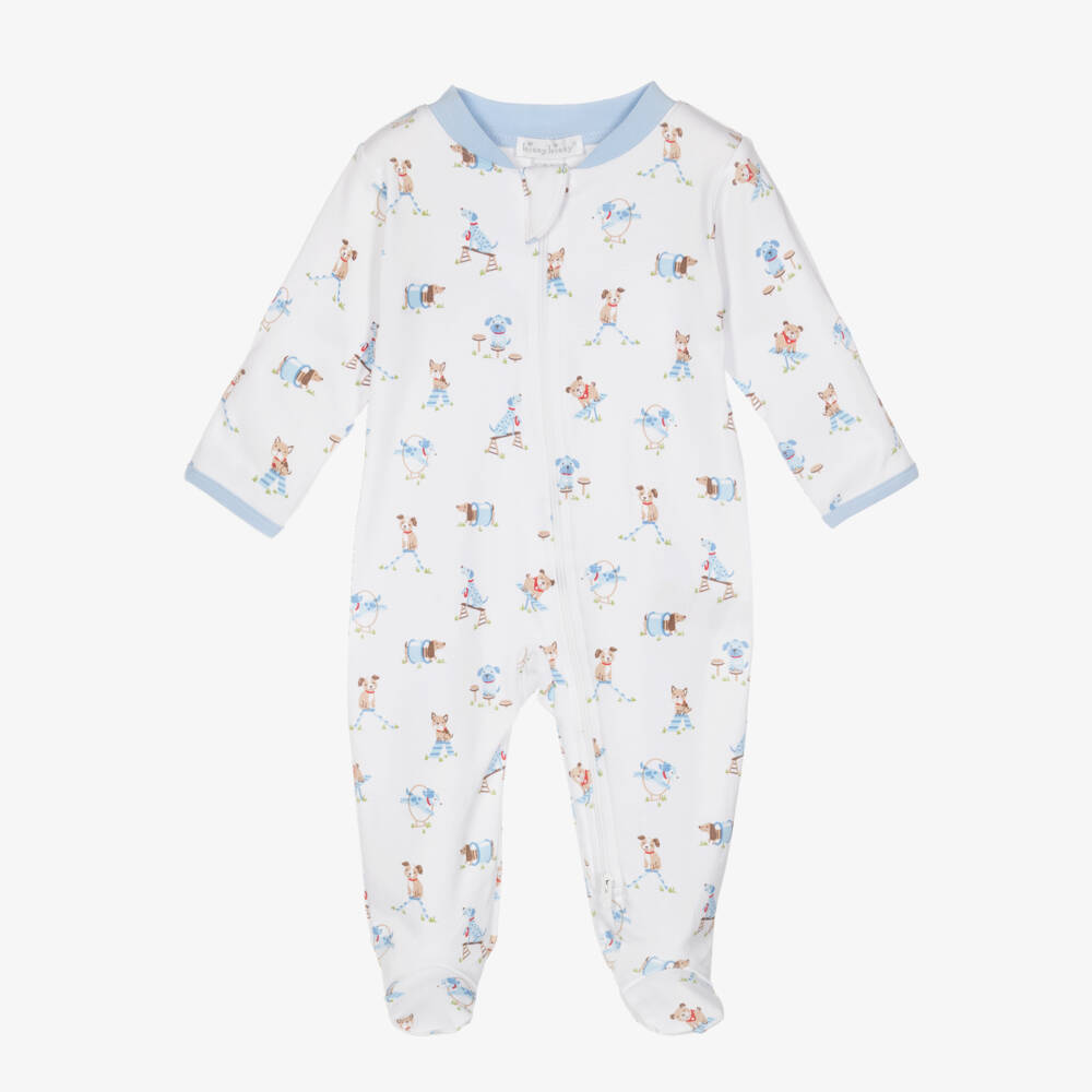 From Kissy Kissy, a cute white Pima cotton babygrow for boys with a playful puppy pattern in blue and beige. Made in super soft jersey for comfort, it has a convenient, two-way zip fastening with a protective chin guard. Smaller sizes have useful, fold-over scratch mitts.