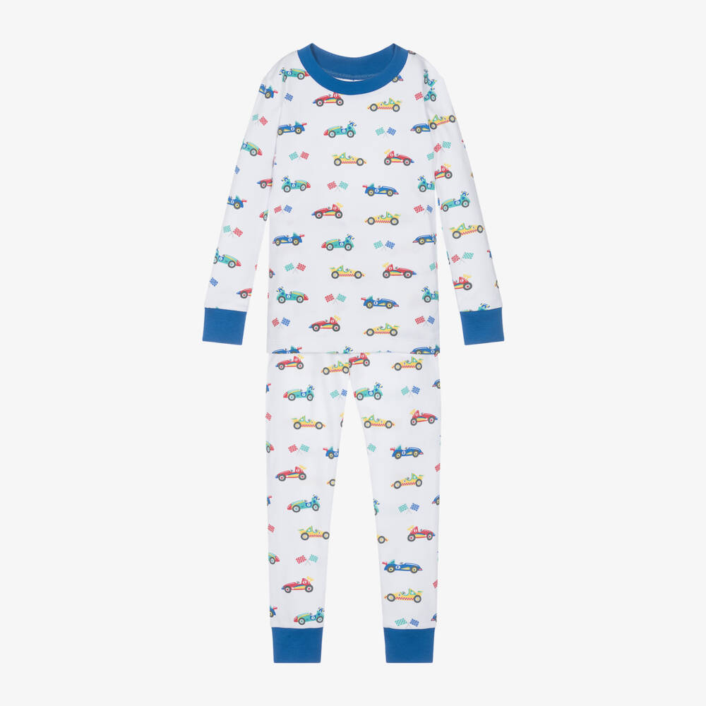 Boys white pyjamas by Kissy Kissy, made in soft Pima cotton jersey. Snug fitting, they have a colourful race car print for a playful look. The pyjama bottoms have an elasticated waist for extra bedtime comfort.