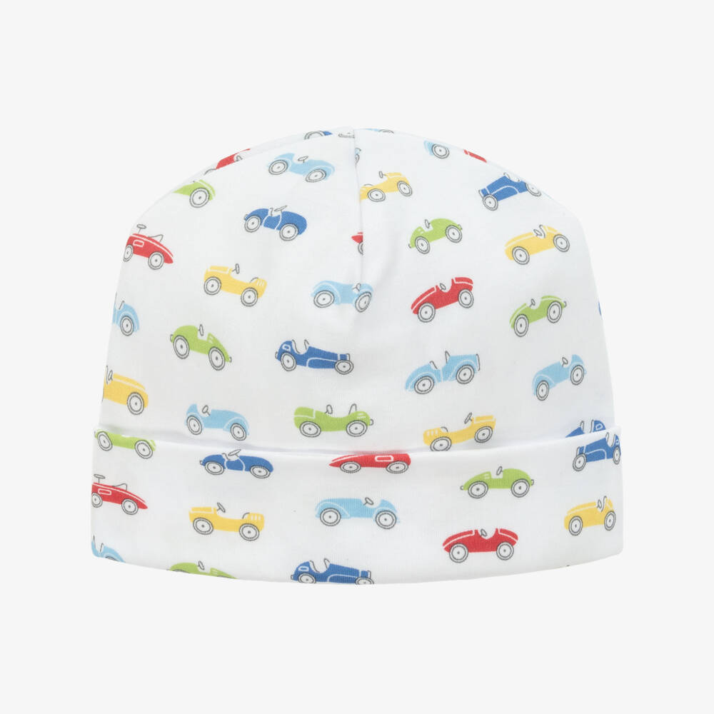 A white layette hat for baby boys by Kissy Kissy, patterned with a colourful car print. It is made in a double layer of beautifully soft Pima cotton jersey for a gentle feel against delicate skin.