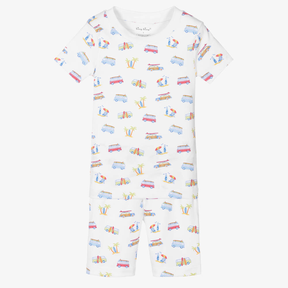 Boys white pyjamas by Kissy Kissy, a playful and cosy nightwear option. Made from soft Pima cotton jersey, they feature a colourful surf truck print. The short sleeves and elasticated waist ensure a comfortable fit for restful sleep during warmer nights.
