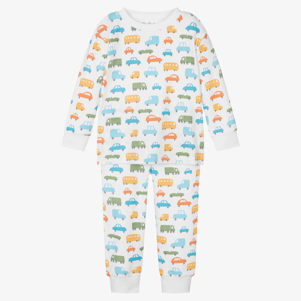 White pyjamas for boys by Kissy Kissy, with a traffic-themed pattern in blue, green and orange. They are made in super soft Pima cotton jersey with ribbed trims for cosy wear and a gently elasticated waistband for a comfortable night's sleep.