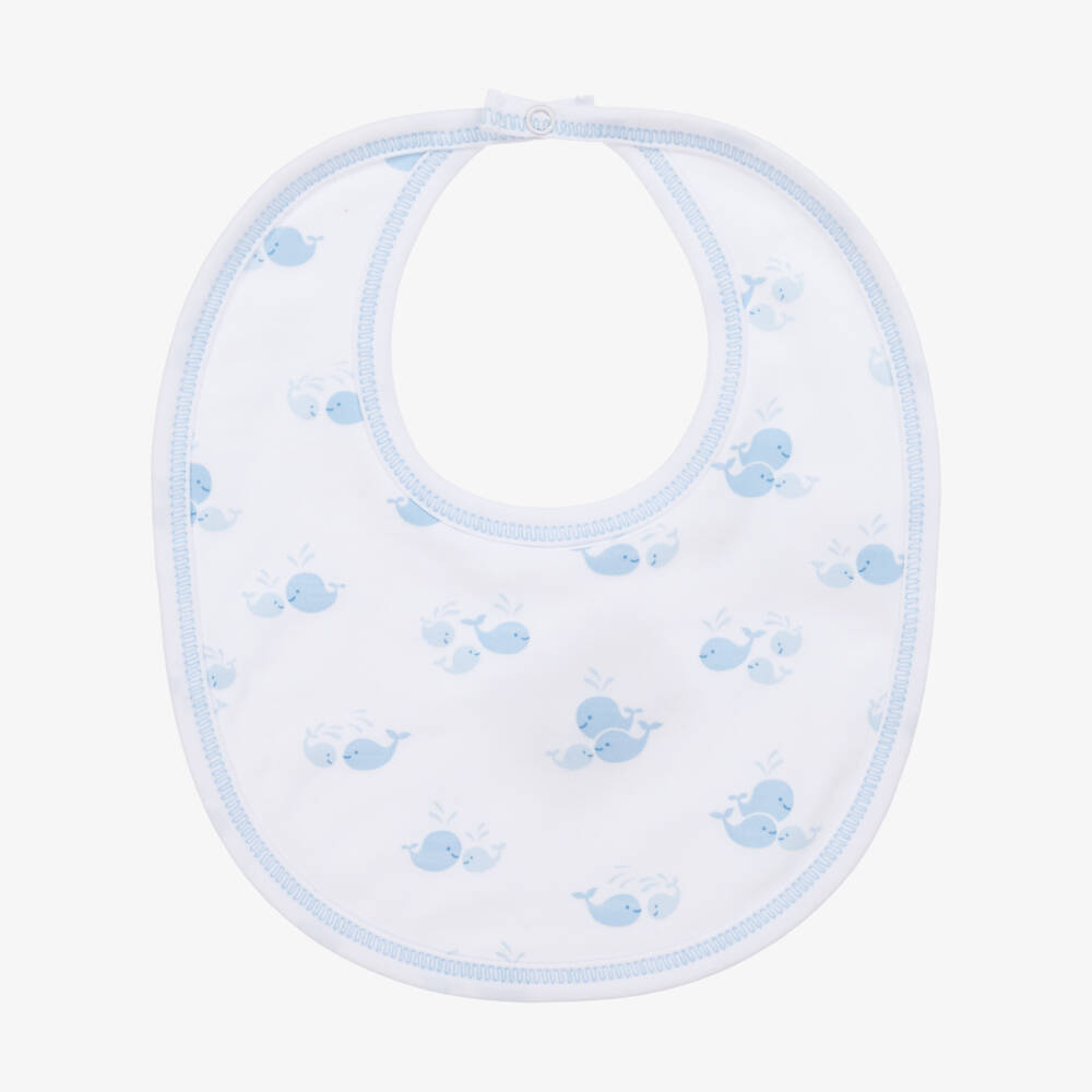 Patterned with cute blue whales, this lovely white Kissy Kissy bib for baby boys is made in super soft Pima cotton jersey. Fastening with a popper, it has an absorbent towelling lining, ideal for catching dribble and spills.